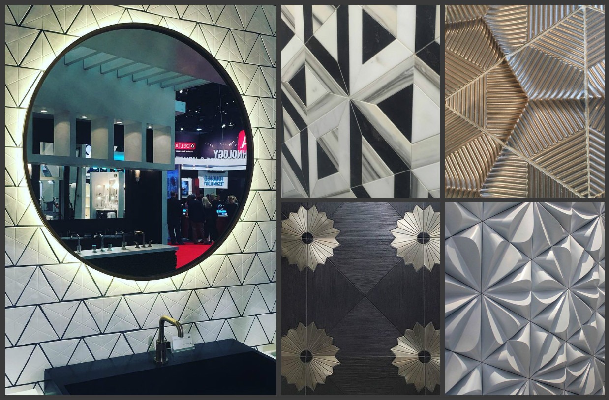 One of the most predominant trends we spotted everywhere was a plethora of artistic and innovative tile patterns and finishes! There were textured backsplashes, Sculptural tile with emphasis on geometric patterns and arabesques and mixed use of materials.