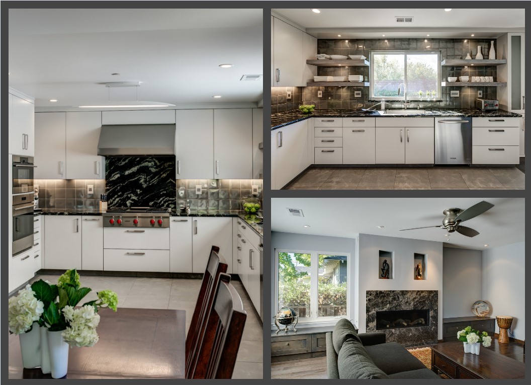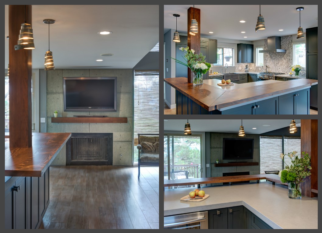 The clients wanted a distinct look so the use of wood, metal, the color gray and tile that took on a cement-like appearance created an urban edge to their space. The warmth of the wooden mantle that coordinates with the wood top on the island unify the living space to the kitchen, while providing warmth to the overall space.
