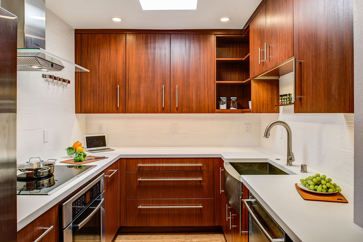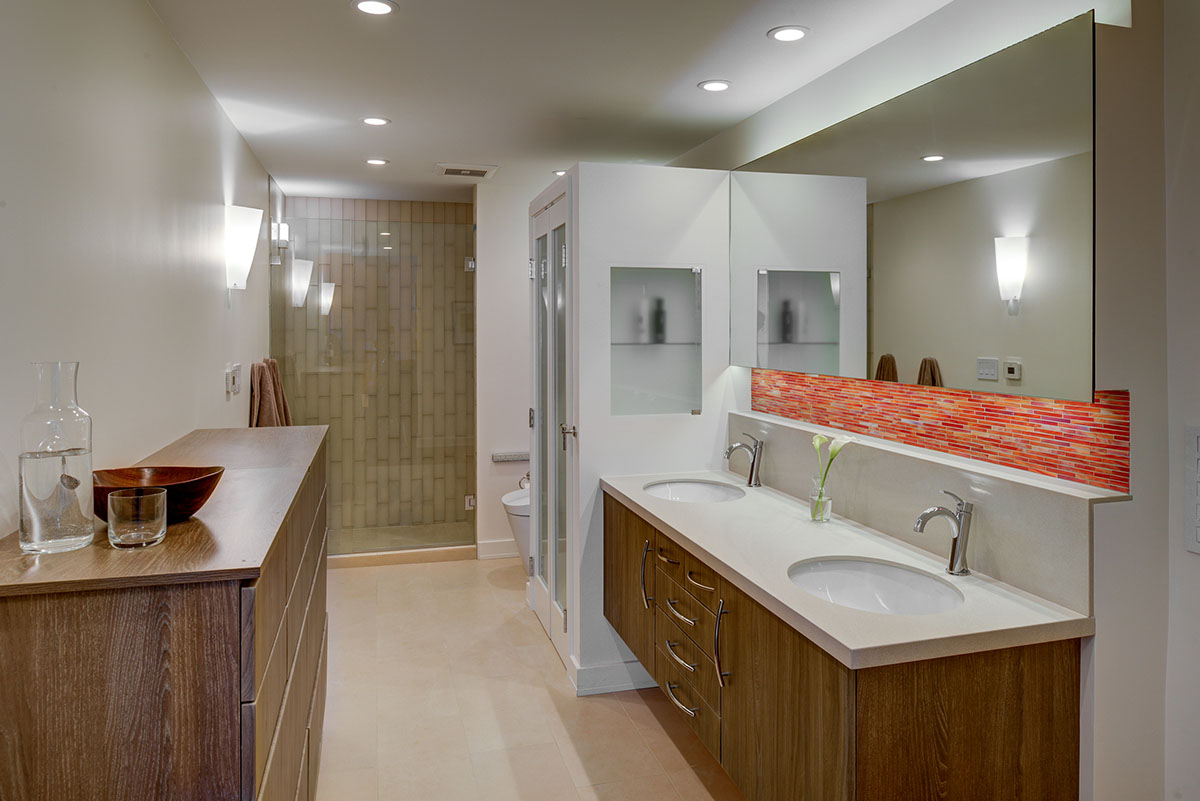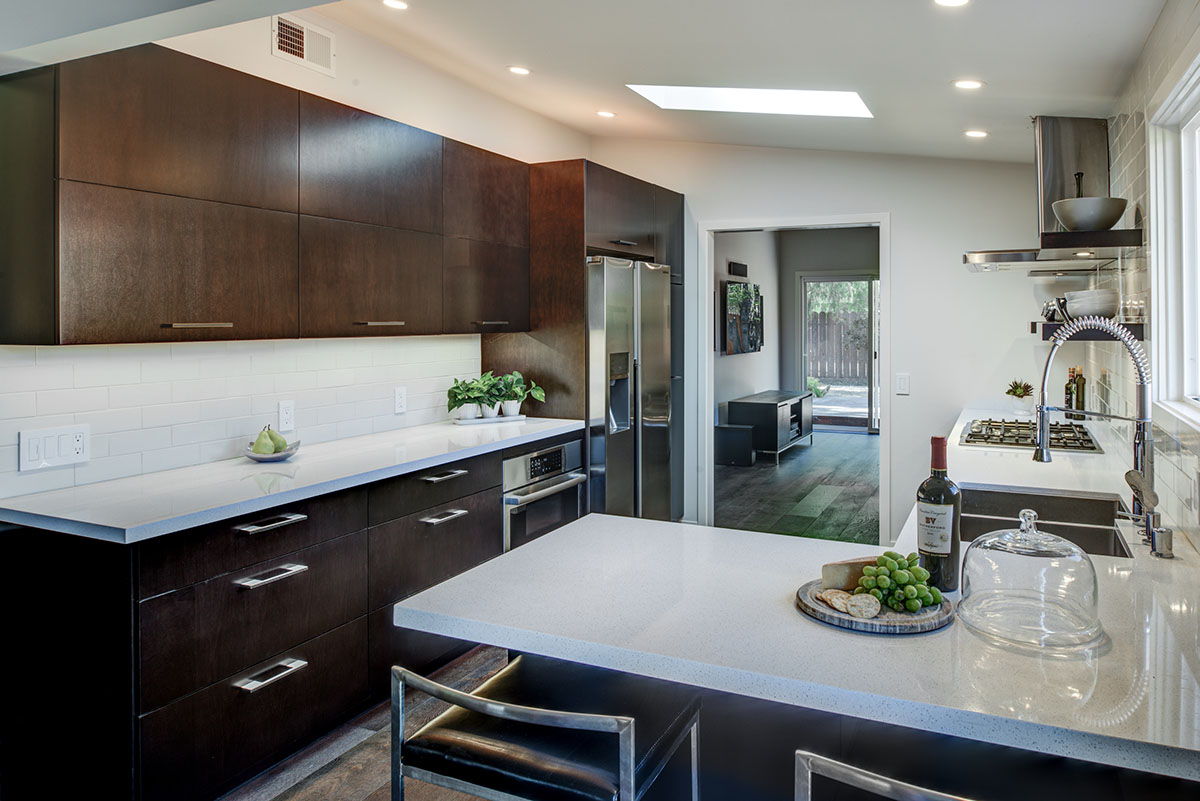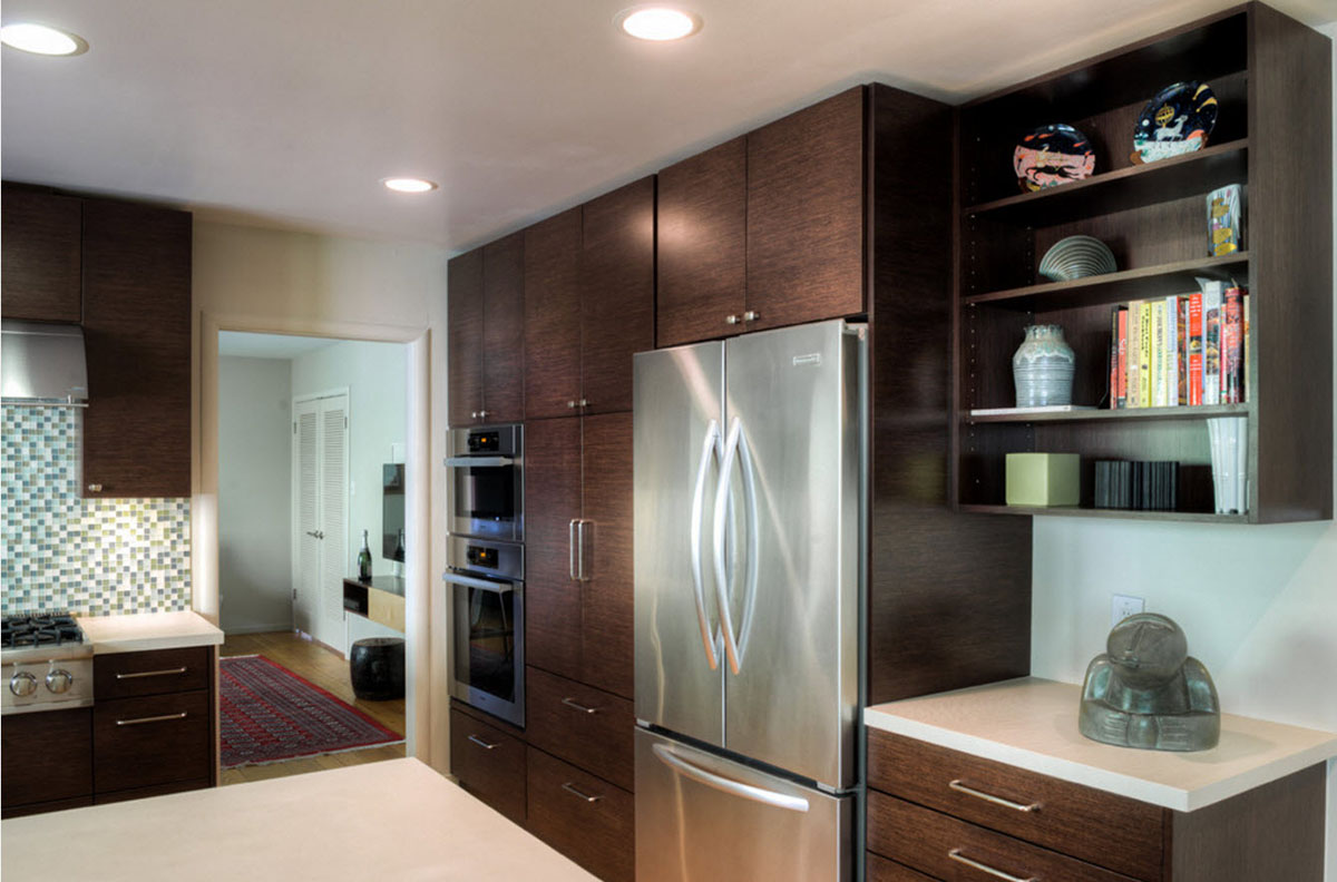 Contemporary kitchens and bathrooms tend to be minimalist, linear and often feature man-made or engineered material such as wooden veneers, wired or textured foils and high gloss cabinet doors, although natural wood doors are also used in contemporary designs.