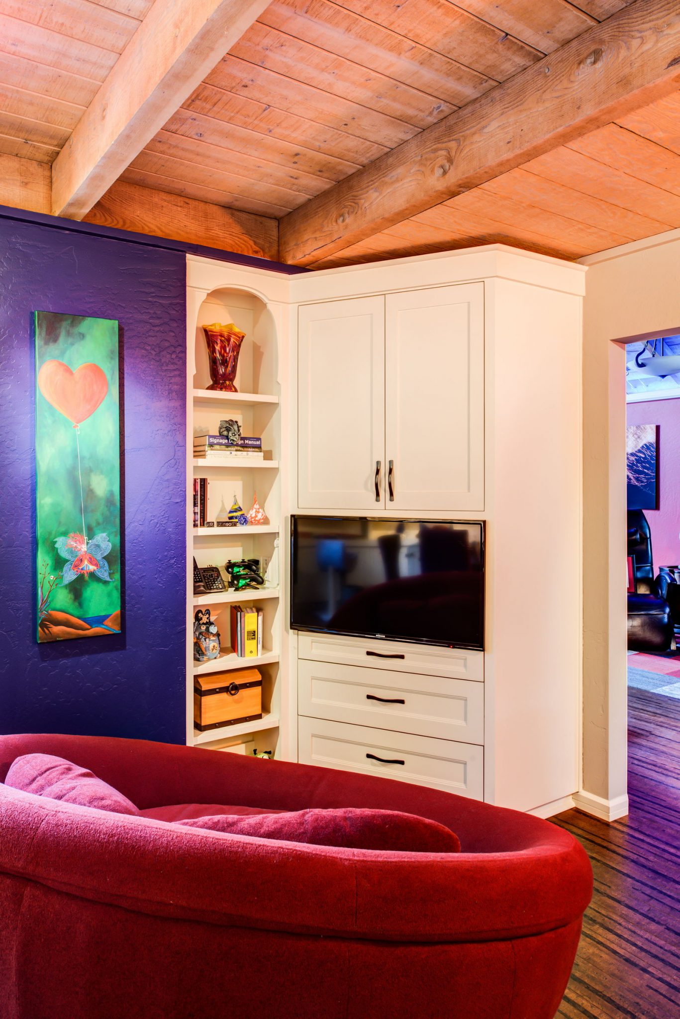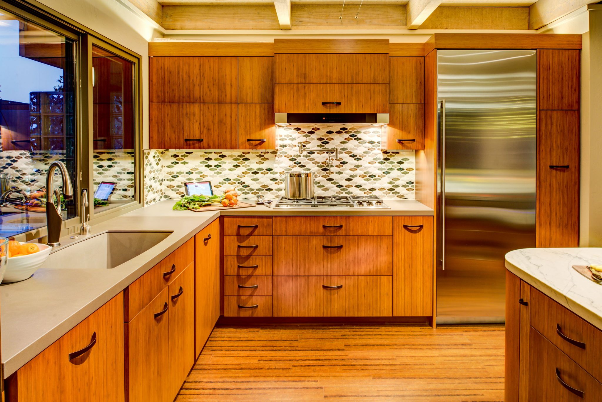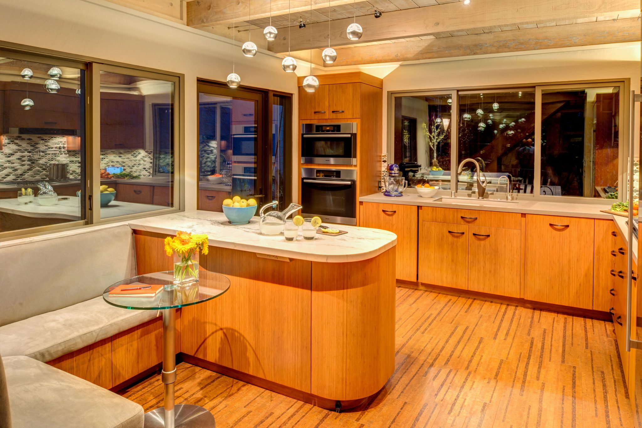 The custom kitchen cabinets chosen were stained bamboo, combined with bamboo flooring in the kitchen area, while white painted cabinets were used for the entry area and in the game room. A variety of organizational inserts were ordered and also made on site to fully maximize the efficiency of the kitchen.