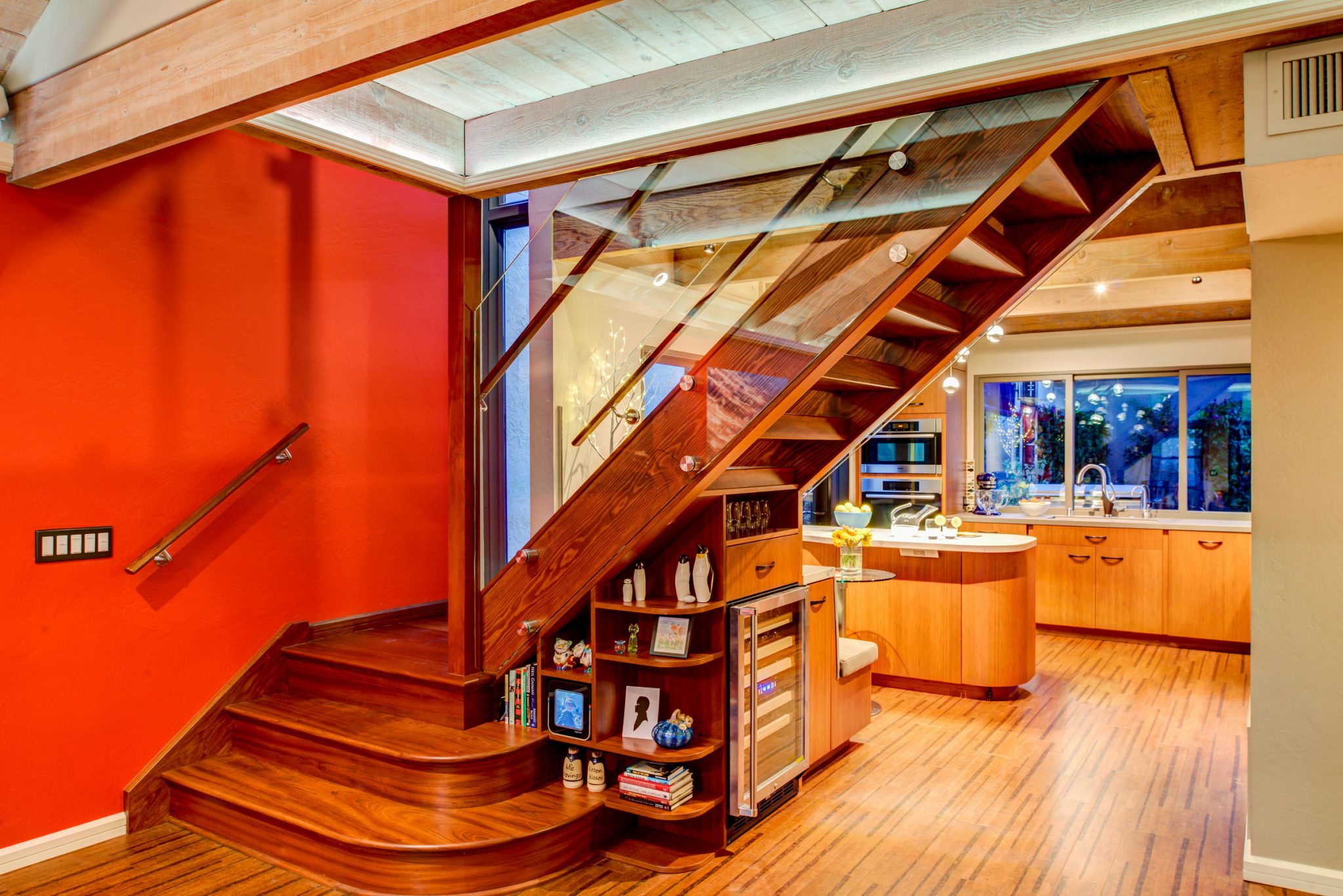 A large wooden staircase obstructed the view of the compact kitchen and made the space feel tight and restricted. The Gilmans Design Build crew converted the heavy wooden staircase into a glass staircase and larger windows were installed to give the space a more spacious look and feel. A small banquette was also designed into the space to allow for more seating, dining, countertop space and storage.