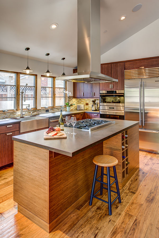This Palo Alto remodel features sustainable bamboo cabinets and an open floor plan. The original kitchen in the 2 bedroom ranch home was small and unconducive, leaving little room for function or visual appeal. It was important for the homeowners to use “green” and sustainable materials and to open up the home to be able to entertain family and friends.