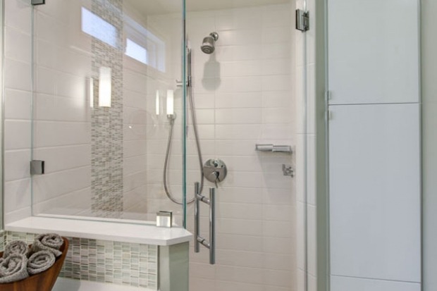 Storage was important to the homeowner, so a linen cabinet was inconspicuously placed in