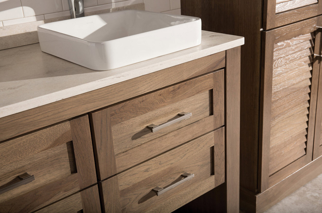 Hickory is primarily grown in the Appalachian region of Pennsylvania and is a very dense hardwood. It is known for its wild variation in grain and color and may contain mineral streaks in the kitchen cabinets. Hickory grain is very prominent and has a completely random appearance as its grain may be straight or have a wavy quality to it. Hickory wood comes in many different stains and may lighten or “bleach” if in direct sunlight.